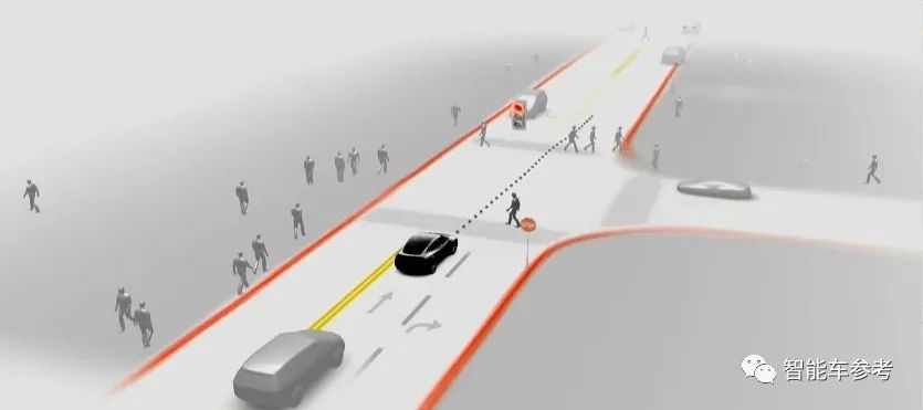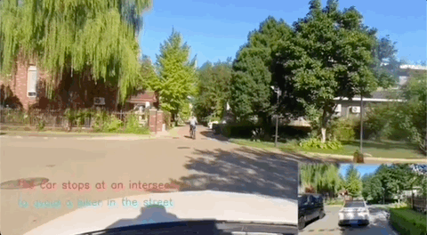 在论文作者提供的测试视频里,这个算法最终上车的效果是这样的。(红色字是车辆行为,蓝色字是解释)