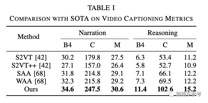 最终显示ADAPT达到了当前最优(State-of-the-Art)的结果,ADAPT在动作描述方面比原有先进方法CIDEr高出31.7,在原因解释方面高33.1。