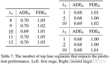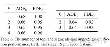 如表6左侧所示,车道段的数量从1增加到4,性能开始随着k的增加有所提升,直到k=3,但在那之后,它开始下降。在第二阶段,k=2提供了比3更好的结果。使用较大的k增加了包含不相关的车道段的概率,而相对较小的k使解码器能够专注于最相关的车道段。