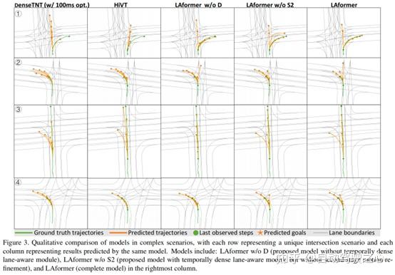 图3显示了LAFormer与Argoverse 1验证集上的亚军模型相比的定性结果。为了确保公平比较,论文使用公开训练的 HiVT [52] 模型来复制他们论文中报告的结果。由于 DenseTNT [15] 不提供经过训练的模型,论文从头开始通过优化(DenseTNT w/100ms opt.)重新训练离线模型,以实现与他们论文中报告的性能相似的性能。所有模型在十字路口的各种交通场景中为目标主体生成合理的多模态预测,例如右转 1 和左转2、4,或加速直行3。但是,LAformer 在右转场景1和加速场景 中生成更准确的预测,而其他模型倾向于预测减速或转弯模式。此外,当时间稠密的车道感知模块被停用时(w/o D vs. w/o S2),LAformer 在横向方向上生成的预测较少。 然而,最右列显示的具有第二阶段细化模块的完整模型保持了良好的预测多样性和准确性。