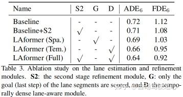 考虑到数据规模和真值的可用性,论文对具有39,472个序列的Argoverse 1验证集进行了消融研究。基线模型预测未来轨迹仅以目标及其邻近智能体的观测轨迹为条件,第二个细化模块(S2)和车道感知估计模块被移除。LAformer (Spa.)仅估计目标位置与车道信息对齐的可能性,类似于空间密集模型。相比之下,LAformer (Tem.)估计每个时间步的位置与时间稠密车道信息对齐的可能性。LAformer(完整)是完整的建议模型。
