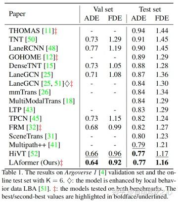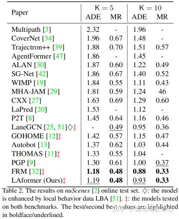 表1和表2分别显示了在Argoverse 1验证和在线测试集以及nuScenes在线测试集上获得的结果。根据官方发布的论文,排行榜结果(在线测试)更新至2023-02-20。