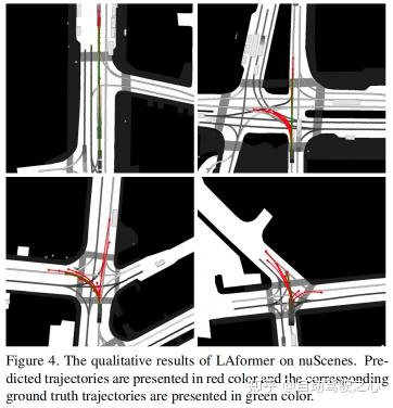 图4显示了LAformer在nuScenes上的更多定性结果 它不仅可以在直行行驶中生成准确的预测,而且可以在复杂的交叉路口生成准确的预测,例如继续向前行驶、左转或右转。 与车道段对齐的多模态预测意味着智能体在交叉路口的运动不确定。