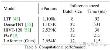 如表 8 所示,LAformer 具有2,645K参数,类似于HiVT-128,但大于LTP和DenseTNT。对于平均有 12个智能体的场景,它的推理时间约为115 ms,与HiVT相比,这不是主要优势。但这种推理速度与 LTP 相当,比DenseTNT和 GP更快,使LAformer在10 Hz时接近实时。