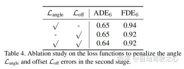 从表3可以看出,Baseline的性能远不如其他模型。 Baseline对比 Baseline+S2和LAformer (Tem.) 对比LAformer (Full)证明了S2的性能增益,例如,3%的FDE。LAformer (Spa.)与 LAformer (Tem.)的比较表明,论文的时间稠密方法比空间稠密方法更有效,将ADE降低约 4%,将FDE降低约 8%。 此外,论文进行了一项消融研究,以分析第二阶段中角度和偏移损失的有效性。如表4所示,通过使用两种损失有助于将预测精度(使用ADE和FDE度量)提高约2%。