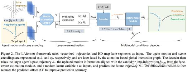 图 2 展示了LAformer的总体框架,它将矢量化轨迹和高精地图车道段作为目标智能体的输入以输出多模态轨迹。下面详细解释LAformer的每个模块。