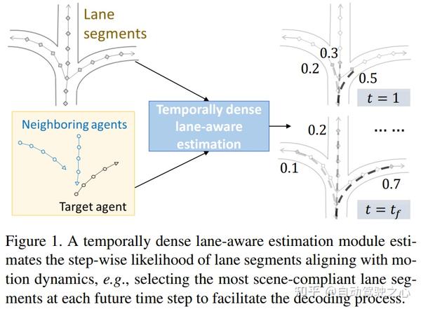 与这些方法相比,论文提出了一个时间稠密的车道感知模块来学习智能体的运动模型和潜在车道段之间的对齐。论文不是简单地结合运动编码和车道编码并允许解码器隐式学习它们的关系[32],而是显式估计智能体在每个时间步将采用的车道的可能性。然后,论文只选择最有可能的车道信息来平衡车道段的可变性和运动模型的不确定性。