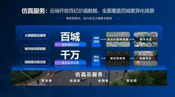 Apollo Cloud 2.0为车企提供超过百城的真实路网、千万公里的场景数据,支持日行千万公里的大规模仿真测试。百度多年来已积累了海量的自动驾驶场景数据,这些数据一方面来源于百度地图大规模路网生成的孪生城市;另一方面来源于Apollo千万公里路测里程积累的海量场景。在Apollo Cloud 2.0帮助下,车企在云端就可轻松验证不同城市、不同场景下的自动驾驶能力,解决因地理环境、路况差异带来的“智车出城难”问题,释放Apollo百亿价值数据,让车企快速积累测试里程,大幅降低研发成本,研发效率提升10倍以上。