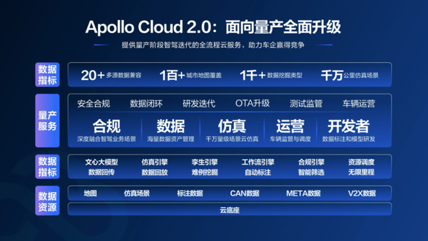 Apollo Cloud 2.0具备精准合规、多模态大模型和城市级仿真服务三项核心服务能力,是解决智驾长尾问题、助力推进量产进程的关键。