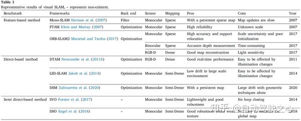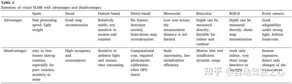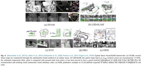 基于直接的方法:2011年,Newcombe等人(2011b)提出了基于直接方法DTAM的单目SLAM框架。与基于特征的方法不同,DTAM采用基于逆深度的方法来估计特征的深度。通过直接图像匹配计算相机的位姿,并通过基于优化的方法构建密集地图(图4(a))。2014年,Jakob等人(2014)提出了LSD-SLAM(图4(b)),这是直接方法在单眼视觉SLAM框架中的成功应用。该方法将面向像素的方法应用于半密集单目SLAM系统。与基于特征的方法相比,LSD-SLAM的灵敏度较低,但当相机内参和照明变化时,系统很脆弱。2017年,Forster等人(2017)提出了SVO(半直接视觉里程计)。它使用稀疏直接法(也称为半直接法)来跟踪关键点(图4(c)的底部),并基于关键点周围的信息来估计位姿。图4(c)顶部显示了室内环境中稀疏地图的轨迹。由于半直接方法跟踪稀疏特征,既不计算描述符,也不处理密集信息,因此SVO具有较低的时间复杂度和较强的实时性。2016年,Engel等人(2018)提出了DSO,该方法还使用半直接方法以确保在更快的操作速度下获得更高的精度。然而,它们只是视觉里程计。由于缺少后端优化模块和回环模块,系统的跟踪误差会随着时间累积。图4(d)显示了DSO(单目视觉里程计)的3D重建和跟踪效果。直接法具有计算速度快、对弱特征条件不敏感等优点。然而,它基于灰度级不变的强烈假设,因此它对照明的变化非常敏感。相反特征点方法具有良好的不变性。2020年,Zubizarreta等人(2020)提出了一种直接稀疏映射方法DSM,这是一种基于光度学束调整(PBA)算法的全单目视觉SLAM系统。表1总结了最先进的视觉SLAM框架的主要特点及其优缺点。除上述典型框架外,还研究了其他相关工作,如(i)稀疏视觉SLAM;(ii)半密集视觉SLAM;(iii)密集视觉SLAM。正如你所看到的,视觉SLAM领域有很多成就,论文只是对流行的方法进行了回顾。即使视觉SLAM提供了良好的定位和建图结果,所有这些解决方案都有优点和缺点。在这项工作中,总结了“基于稀疏的方法”、“基于密集的方法”和“基于特征的方法”的优缺点,“基于直接的方法”,“单目方法”,”双目方法“,”RGB-D方法“和”事件相机方法“可在表2中找到。