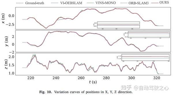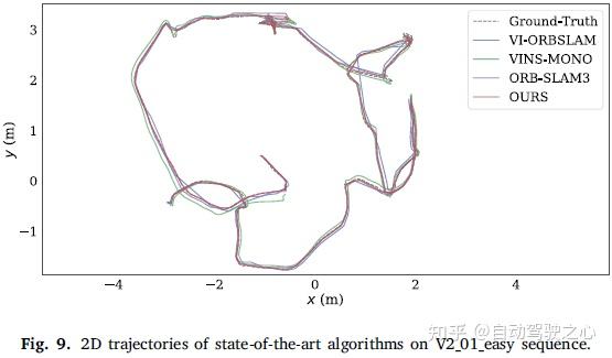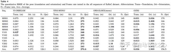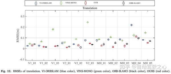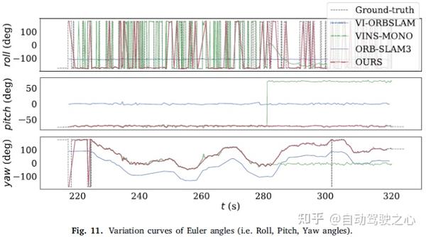EuRoC数据集V2_01_easy序列上算法的2D轨迹如图9所示。可以看到,与GT相比,每个算法的测试结果都有不同程度的偏差,论文算法的轨迹(红线)更接近GT(黑虚线),而VI-ORBSLAM(蓝线)的漂移最大。X、Y、Z方向的位置变化曲线如图10所示。欧拉角(即横摇、俯仰、偏航)的比较曲线如图11所示。表4显示了在整个11个序列中测试的同一CPU平台(i7-9700 CPU)中的定量均方根误差(RMSE)结果和帧速率,因为所有算法都采用多线程,所以表4的第三列报告了处理图像流时的帧速率。图12和图13分别提供了平移误差的RMSE和累积分布函数(CDF),图14和图15分别提供了定向误差的RMSE和累积分布功能(CDF)。可以知道,论文之前的工作,一个快速单目视觉惯性系统,具有改进的迭代初始化策略方法,在几乎所有序列中实现了最佳的定位精度。实际上,由于出色的初始化过程,论文的方法在六个序列和七个序列上提供了最佳的定向性能,即使系统无法提取ORB特征,系统也可以快速重新启动工作。