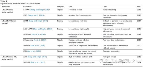 目前,多传感器融合方法(如视觉-LIDAR-IMU融合SLAM)被认为适用于L3级别的自动驾驶,并引起了许多学者的关注。基于激光雷达的SLAM系统可以获得广泛的环境细节,但在缺乏结构信息的场景(尤其是自动驾驶场景)中很容易失败。例如,长长的走廊或开阔的广场。基于视觉的方法在具有丰富纹理信息的场景中表现良好,并且很容易重新识别场景(Shin等人,2020)。但它对照明、快速移动和初始化过程的变化非常敏感。因此,激光雷达和视觉传感器经常与IMU融合,以提高系统的准确性和鲁棒性。IMU可以消除点云的运动失真,并在缺乏特征的环境中持续一段时间,同时可以帮助视觉系统恢复尺度信息。目前,关于视觉-LIDAR-IMU融合SLAM的研究成果很少(Debeunne和Vivet,2020b)。一些学者尝试使用视觉-IMU融合系统(即视觉-惯性系统,VIS)和LIDAR-IMU融合系统(如LIDAR-惯性系统,LIS),因为这两个单独的模块进一步融合,以形成性能更好的视觉-LIDAR-IMU融合系统(LIDAR-视觉-惯性系统,LVIS)(Chen等人,2018)。本文还介绍了激光-IMU融合SLAM方法的研究情况。