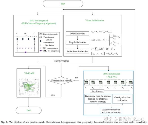 需要估计的初始参数包括比例因子、速度、重力以及加速度计和陀螺仪的偏差。为了使所有变量都可观察到,纯ORB-SLAM系统需要执行几秒钟。该方法的具体步骤如下:首先,执行视觉初始化过程,包括ORB提取、地图初始化和初始位姿估计。其次,采用IMU预集成技术对IMU相机进行频率对准,生成关键帧。第三,提出了一种改进的基于信赖域的迭代策略,用于陀螺偏差估计,并对重力方向进行了细化。最后,在先前估计的基础上估计加速度计偏差和视觉尺度。论文之前工作的管道如图8所示。