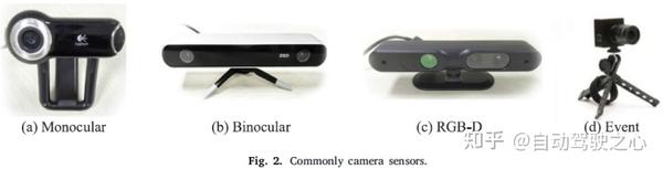 根据传感器类型的不同,常见的视觉传感器主要可分为单目、双目、RGB-D和事件摄像机。摄像机传感器如图2所示。