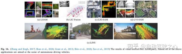 基于LIDAR-IMU融合的方案分为两类:松耦合和紧耦合方案。典型的松耦合方案是LOAM,(图16(a))和LeGO-LOMA(Shan和Englot,2018),其中IMU测量信息未用于优化步骤。与松耦合方案相比,紧耦合方案处于开发阶段,这通常大大提高了系统的准确性和鲁棒性。在当前公开的紧密耦合系统中,LIO-Mapping(Ye等人,2019)使用VINS-Mono中的优化过程来最小化IMU残差和LIDAR测量误差。由于LIO建图旨在优化所有测量值,因此系统的实时效果较差。Zou等人提出了LIC融合,如图16(b)所示。它融合了点云中提取的LiDAR特征和稀疏视觉特征,蓝色和红色的LiDARR点分别是平面和边缘特征,估计的轨迹用绿色标记。为了节省计算资源,LIO-SAM(图16(c))引入了滑动窗口优化算法,使用因子图方法联合优化IMU和LIDAR的测量约束。LINS(图16(e)),专门为地面车辆设计,使用基于误差状态的卡尔曼滤波器迭代修正待估计的状态量。Zhang和Singh(2018)提出了一种紧密耦合的LVIO(激光雷达视觉惯性里程表)系统,该系统使用从粗到精的状态估计方法,从IMU预测开始进行粗略估计,然后由VIO和LIO进一步细化。目前,LVIO算法是KITTI数据集上测试精度最高的算法。Zoo等人(2019)基于MSCKF框架实现了时空多传感器的在线校准。不幸的是,Zhang和Singh(2018)和Zoo等人(2019)实施的代码目前不是开源的。Shan等人(2021)于2021发布了最新的可视化LIDAR-IMU紧耦合方案:LVI-SAM(图16(d))。为了提高系统的实时性能,它使用了平滑和建图算法。作者将视觉IMU和激光雷达IMU视为两个独立的子系统。当检测到足够多的特征点时,这两个子系统将链接在一起。当其中一个子系统检测不到时,这两个子系统可以独立分离,因为不会相互影响。表5总结了近年来视觉-惯性SLAM框架中的主要算法。