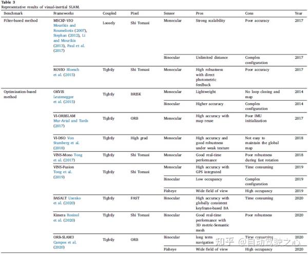 与室内或室外移动机器人不同,自动驾驶车辆具有更复杂的参数,尤其是当车辆在城市环境中自动驾驶时。例如,环境的面积更大,有动态障碍,因此视觉SLAM方法的性能不够准确和鲁棒(Cadena等人,2016a)。诸如误差累积和照明变化以及快速运动等问题导致有问题的估计。已经考虑了各种方法来解决与自动驾驶车辆相关的这些问题。例如用于视觉里程(VO)的基于特征点/直接/半直接/点线融合的算法(Singandhupe和La,2019),以及用于姿态估计的扩展卡尔曼滤波器(EKF)/基于图的优化算法(Takleh等人,2018)。同时,基于视觉的多传感器融合方法也为提高自主系统的精度而引起了极大的关注。