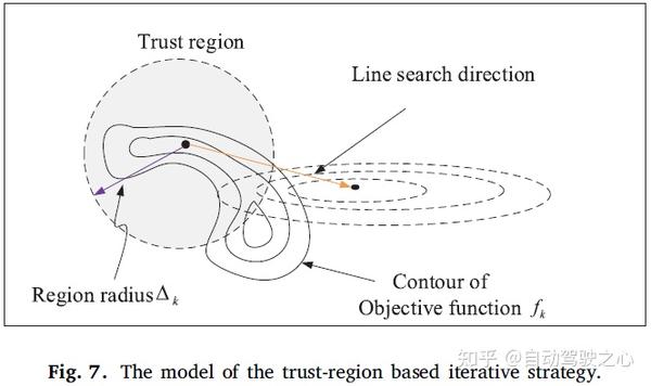 为了直观地理解上述SLAM方法的定位效果,在配备Intel Core i7-9700 CPU、16 GB RAM和Ubuntu18.04+Melodic操作系统的同一机载计算机上测试了一些典型算法,并将其与我们之前的一项工作(Cheng等人,2021a)进行了比较。如Cheng等人(2021a)所述,基于传统的高斯-牛顿(G-N)线性迭代策略,提出了一种改进的信赖域迭代策略,然后将该策略集成到VI-ORBSLAM框架中(Mur-Artal和Tards,2017),以实现更快的初始化和更高的定位精度。信任区域迭代策略的模型如图7所示。它结合了最速下降算法和G-N算法,用信任模型逼近目标函数。当解被认为是当前点附近模型函数的最小值时,则在每个迭代步骤中求解最小化子问题。