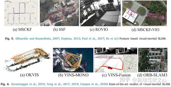 基于优化的方法:就基于优化的VI-SLAM系统而言,最经典的框架是OKVIS。2015年,Leutinegge等人提出了OKVIS,它使用IMU测量值来预测当前状态、空间点和二维图像特征,以构成重投影误差。预测的IMU状态量和优化的参数构成IMU误差项,然后再投影误差与IMU误差相结合以进行优化。2017年,Tong等人(2017)提出了VINS-Mono,它被视为一种优秀的单目VI-SLAM系统,前端采用光流方法,后端采用基于滑动窗口的非线性优化算法(Cheng等人,2021b)。此外,VINS-Mono的初始化方法值得注意,它采用了不相交方法(以及VI-ORBSLAM Mur Artal和Tards,2017),该方法首先初始化纯视觉子系统,然后估计IMU(加速度计和陀螺仪)的偏差、重力、比例和速度。通过KITTI和EuRoC数据集的测试,VINS Mono已被证明具有与OKVIS相当的定位精度,在初始化和环路闭合阶段具有更完整和鲁棒性。2019年,VINS-Mono团队提出了双目版本,并整合了GPS信息,VINS-Fusion(Tong等人,2019)。如图6(c)所示,由于增加了GPS测量,它在户外环境中实现了良好的定位和建图效果,并且被认为是自动驾驶车辆领域的一个良好应用。2020年,Campos等人(2020)提出了一种基于特征的紧密集成视觉惯性SLAM系统ORB-SLAM3。这是通过最大后验(MAP)算法实现的更高效初始化过程的最新成果,并且它实现了多地图功能,该功能依赖于具有改进的召回率的新地点识别方法。此外,该系统能够使用单目、双目和RGB-D相机执行视觉、视觉-惯性和多地图SLAM。户外场景的实验结果如图6(d)所示。ORB-SLAM3的管道与ORB-SLAM2类似,整个系统由三个线程组成:跟踪、局部建图和回环线程。此外,ORB-SLAM3可以在长时间的不良视觉信息中生存,当它丢失时,它会启动一个新的地图,当重新访问地图区域时,它将与以前的地图无缝合并。表3总结了近年来视觉惯性SLAM框架中的主要算法。目前,基于优化的VI-SLAM方法已成为主流。除上述方法外,还有其他最先进的工作可以总结如下,但不限于BASALT、Kimera、ICE-BA、Maplab、StructVIO。