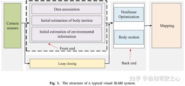 与室内或室外移动机器人不同,自动驾驶车辆具有更复杂的参数,尤其是当车辆在城市环境中自动驾驶时。例如,环境的面积更大,有动态障碍,因此视觉SLAM方法的性能不够准确和鲁棒(Cadena等人,2016a)。诸如误差累积和照明变化以及快速运动等问题导致有问题的估计。已经考虑了各种方法来解决与自动驾驶车辆相关的这些问题。例如用于视觉里程(VO)的基于特征点/直接/半直接/点线融合的算法(Singandhupe和La,2019),以及用于姿态估计的扩展卡尔曼滤波器(EKF)/基于图的优化算法(Takleh等人,2018)。同时,基于视觉的多传感器融合方法也为提高自主系统的精度而引起了极大的关注。