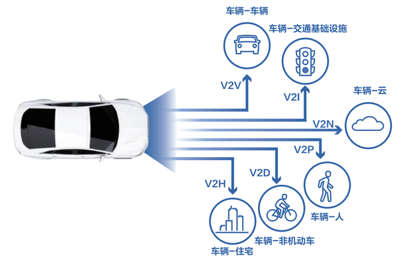 下图示意说明了自动驾驶车辆与不同交通要素间的协同关系,实现“交通场景万物互联”。