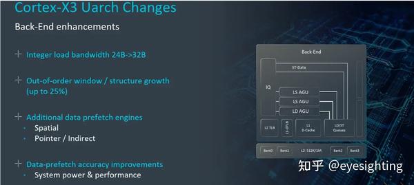 Cortex-A76 前端采用 4 宽解码乱序 超标量设计。每个周期可以获取 4 条指令。重命名并调度 4 个 Mops,每个周期 8 个 µop 。无序窗口大小为 128 个条目。后端有 8 个执行端口,管道深度为 13 级,执行延迟为 11 级。