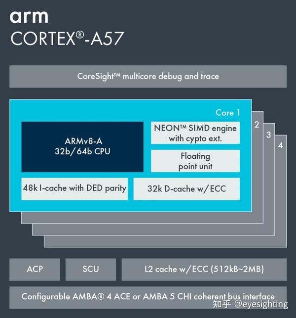 ARM Cortex-A57是实现ARM Holdings设计的ARMv8-A 64 位指令集的中央处理单元。Cortex-A57 是一个无序超标量管道。它可作为SIP 内核提供给被许可方,其设计使其适合与其他 SIP 内核(例如GPU、显示控制器、DSP、图像处理器等)集成到构成片上系统(SoC) 的一个芯片中。