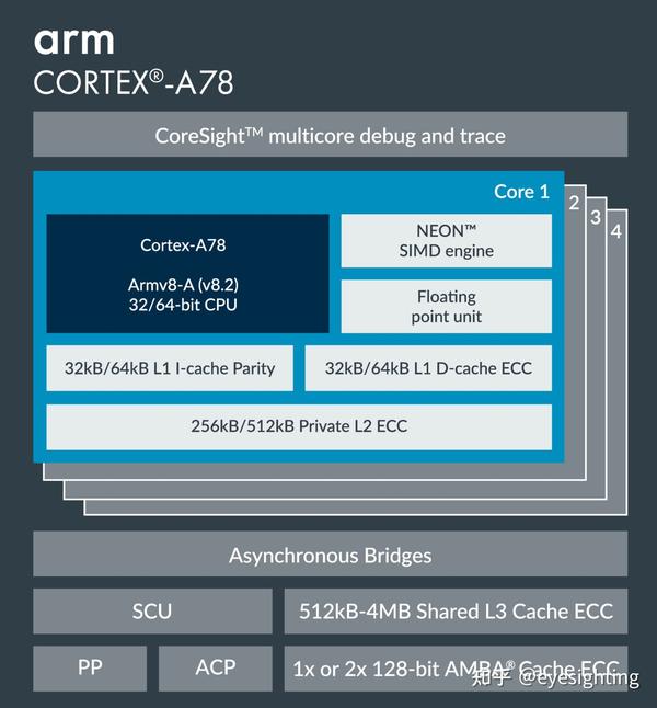 Cortex-A78 是一种 4 宽解码乱序 超标量设计,具有 1.5K 宏 OP (MOP) 缓存。它每个周期可以获取 4 条指令和 6 个 Mops,并且每个周期可以重命名和分派 6 个 Mops 和 12 µops。乱序窗口大小为160个条目,后端有13个执行端口,管道深度为13级,执行延迟由10级组成。