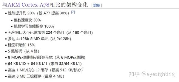 Cortex-A78 是一种 4 宽解码乱序 超标量设计,具有 1.5K 宏 OP (MOP) 缓存。它每个周期可以获取 4 条指令和 6 个 Mops,并且每个周期可以重命名和分派 6 个 Mops 和 12 µops。乱序窗口大小为160个条目,后端有13个执行端口,管道深度为13级,执行延迟由10级组成。