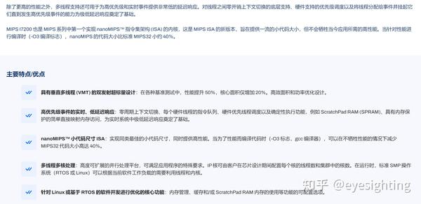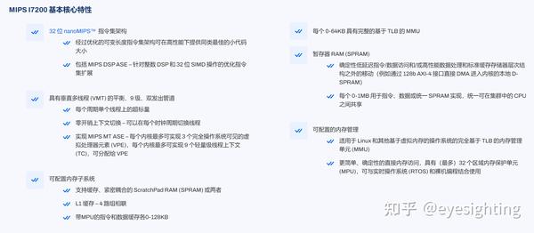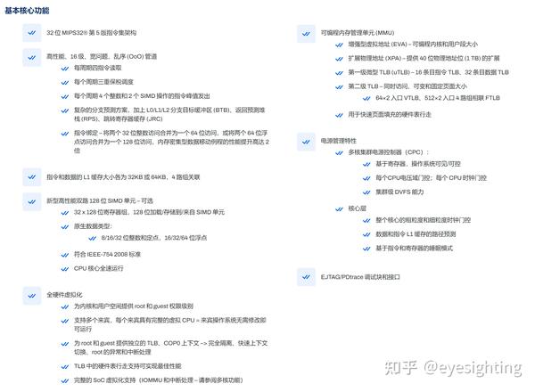 IP核:MIPS 提供全面的低功耗、高性能 32 位和 64 位处理器 IP 内核产品组合,范围从高端移动应用处理器到用于深度嵌入式微控制器的极小内核。架构:基于三十多年来不断创新的传统,MIPS 架构是业界最高效的 RISC 架构,在给定的硅面积内提供最佳的性能和最低的功耗。技术:功能安全、多域安全。