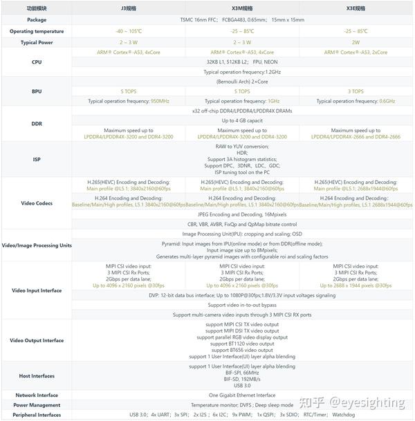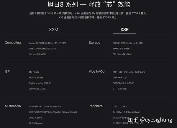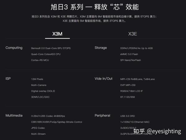 旭日Sunrise3(简称 X3)和征程Journey3(简称 J3)是地平线2020年推出的低功耗、高性能AI处理器,分别面向人工智能物联网AIoT领域和自动驾驶AUTO领域。 其中,X3 还根据用户场景需求不同,进一步划分出X3M和X3E两个芯片版本。计算能力方面,X3M和J3均内置了Quad-Core Cortex A53 CPU和Dual-Core BPU AI加速器,其中BPU加速器采用了伯努利2.0架构设计,可提供5TOPS的等效AI算力。