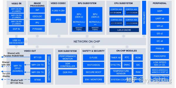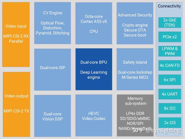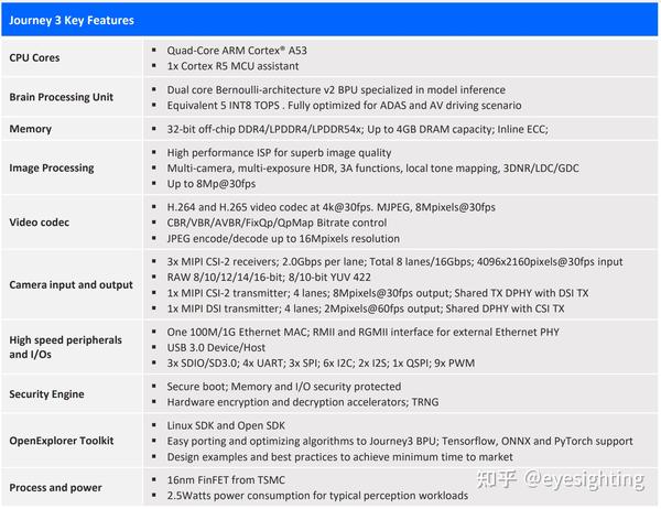Journey 3处理器是一个精心平衡的片上系统,将尖端节能的伯努利BPUTM(大脑处理器单元)与许多其他引擎集成在一起,如四核Cortex A53 CPU、辅助Cortex R5 MCU、高性能ISP、多功能视频编解码器、安全加密引擎以及高速外围设备和I/O,以实现最大的灵活性。