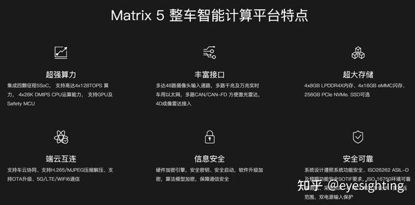 Matrix®5 是业界领先的面向下一代软件定义汽车的中央计算平台参考设计。Matrix 5 将助力Tier1,ODM以及OEM客户完全释放潜能,打造出极具竞争力的解决方案,应对高阶自动驾驶以及智能座舱多模人机交互HMI的多样化需求。