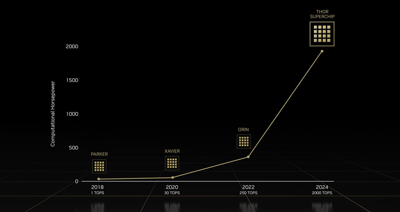 英特尔、英伟达、高通进军汽车行业后,正在开发高算力芯片,其中英伟达推出的Thor芯片算力已经达到了2000TOPS(每秒运算2000万亿次)。