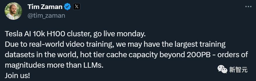 特斯拉工程技术总监Tim Zaman发推称,特斯拉上线的H100集群,将被用于训练视频数据。