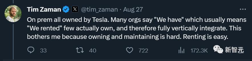 同时他还称,特斯拉是真正「物理上」拥有这些GPU集群和算力。很多其他的公司宣称自己「拥有」多大算力时,其实他们只是能「租到」这些算力。
