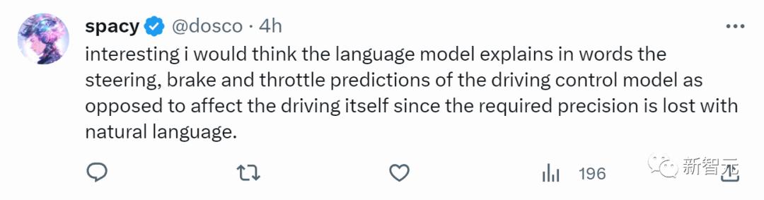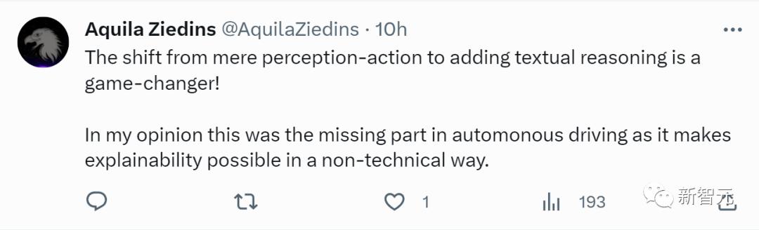 「从单纯的感知行动到添加文本推理,这种转变改变了游戏规则!在我看来,这正是自动驾驶中缺失的部分,因为它以非技术性的方式使可解释性成为可能。」