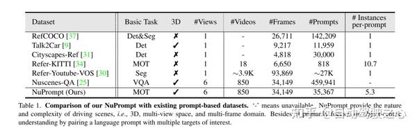 为了推进驾驶场景中提示学习的研究,本文提出了一种新的大规模基准,名为NuPrompt。基准测试是建立在流行的多视图3D目标检测数据集Nuscenes[2]上的。本文将语言提示分配给具有相同特征的目标集合,以便为它们奠定基础(for grounding them)。从本质上讲,这个基准提供了许多3D实例-文本匹配,具有三个主要属性: 1.真实驾驶描述。与现有的基准测试只表示来自模块化图像的2D目标不同,本文数据集的提示描述了来自3D、环顾四周和长时间空间的各种与驾驶相关的目标。图1展示了一个典型的例子,即一辆车在多个视图中从后面到前面超过了我们的车。2.实例级提示标注。每个提示符都表示一个细粒度的、有区别的、以目标为中心的描述,并允许它覆盖任意数量的驱动目标。3.大规模语言提示。就提示符的数量而言,NuPrompt可以与当前最大的数据集[7]相媲美,即包含35367个语言提示符。