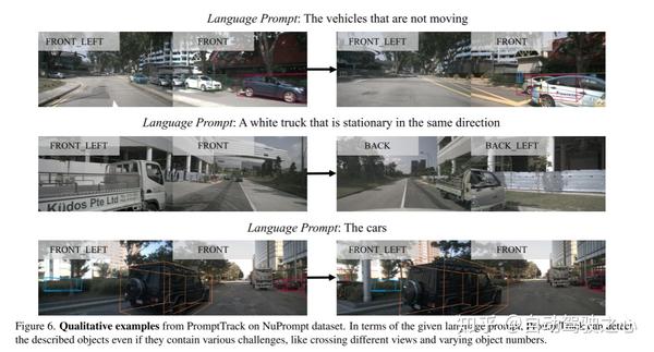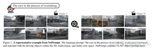 图1。一个来自NuPrompt的典型例子。语言提示“正在超车的车辆”,在三维、多帧、多视图空间内精确注释并匹配驾驶目标。NuPrompt包含35367个目标-提示符对。