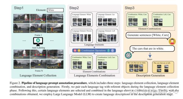 图2。语言提示标注过程Pipeline,包括三个步骤:语言元素收集、语言元素组合、描述生成。首先,在语言元素收集阶段,本文将每个语言标签与 referent objects 配对。然后,在语言元素组合阶段,选择并组合某些语言元素。最后,根据得到的组合,在描述生成阶段采用大型语言模型(LLM)创建语言描述。