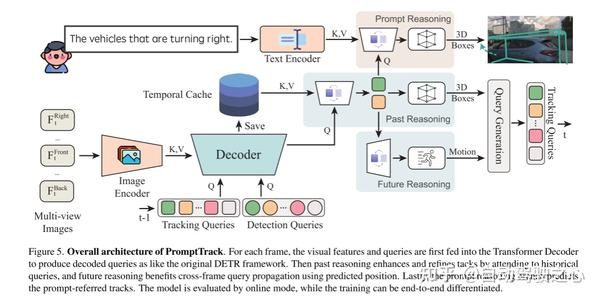 图5。PromptTrack的总体架构。对于每一帧,视觉特征和查询首先被输入到Transformer解码器中,以产生类似于原始DETR框架的解码查询。然后,过去的推理通过处理历史查询来增强和改进策略,而未来的推理则有利于使用预测位置进行跨帧查询传播。最后,快速推理分支预测 prompt-referred 轨迹。该模型采用在线模式进行评价,训练可进行端到端 differentiated。