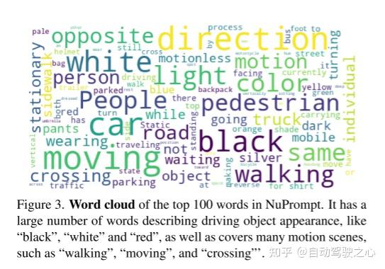 图3。NuPrompt的前100个单词的词云。它有大量的词来描述驾驶物体的外观,如“黑”、“白”、“红”等,并涵盖了许多运动场景,如“走”、“动”、“过”等。