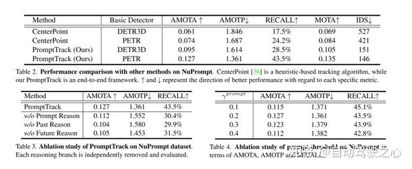 与基准一起,本文制定了一个新的基于提示的感知任务,其主要目标是使用给定的语言提示来预测和跟踪驾驶环境中的多个 3D目标。该任务的难点在于两个方面:跨帧时间关联和跨模态语义理解。为了解决这一挑战,本文提出了一种端到端的基线,它建立在camera-only 3D tracker PF-Track[24]上,命名为PromptTrack。请注意,PF-Track通过它的过去和未来推理分支展示了出色的时空建模。此外,本文增加了一个快速推理分支来进行跨模态的融合和理解。具体来说,本文的提示推理涉及到提示嵌入和查询特征之间的交叉注意力,这些特征来自过去的推理,进一步预测 prompt-referred 目标。