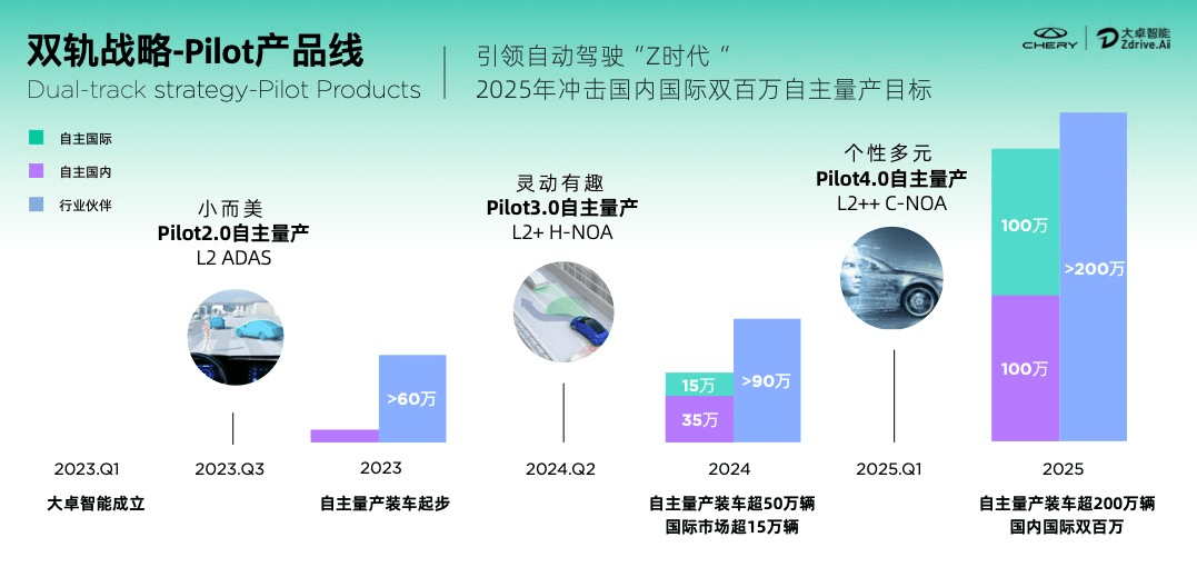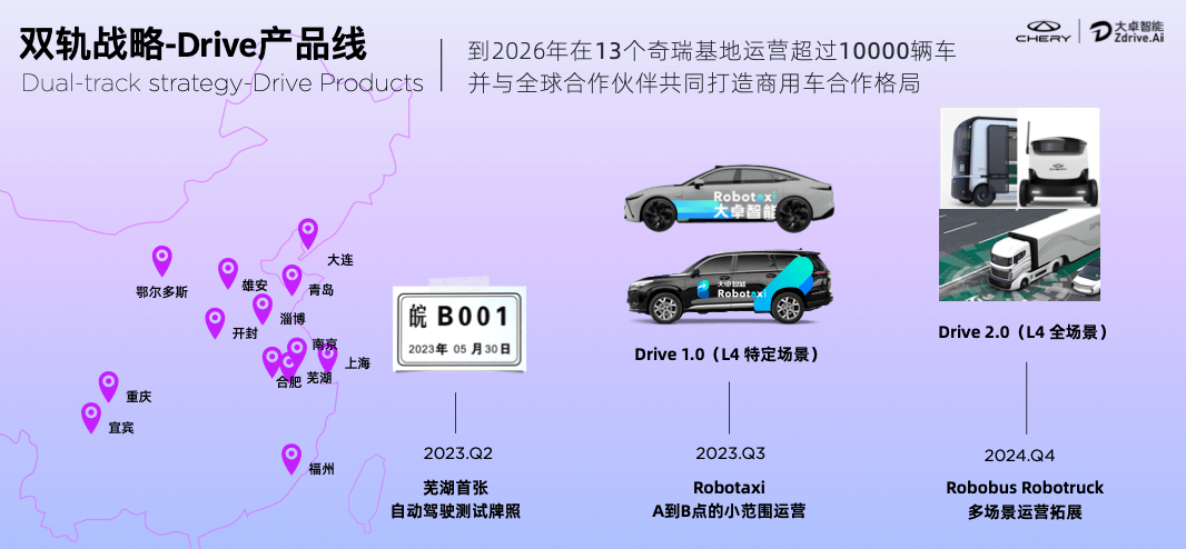 未来三年内,大卓智能将通过自主研发的智能驾驶技术栈,打造的ADAS产品Pilot 4.0,实现城市NOA和高速NOA,以及L4级自动驾驶产品Drive 2.0,提供全无人化运营,并围绕奇瑞全国十三个生产基地投放1万台载人或载物的车辆。