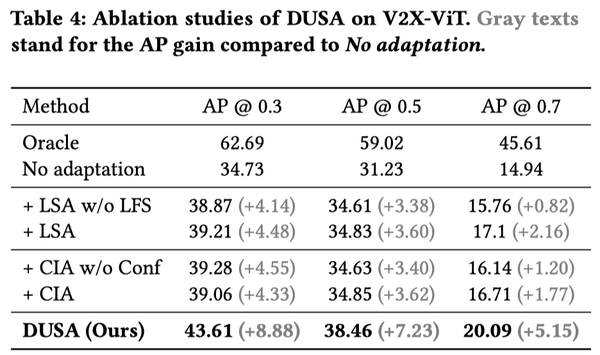 在这项工作中,我们提出了一种新的用于 V2X 协作检测的无监督 sim2real 域适应方法,称为解耦无监督 Sim2Real 适应(DUSA)。 它将V2X协作sim2real域适应问题解耦为两个子问题:sim2real适应和智能体间适应,并分别用LSA模块和CIA模块来解决它们。 LSA 模块利用位置重要性来鼓励特征提取器产生模拟/真实不变特征。 CIA 模块利用置信度线索帮助特征提取器输出代理不变特征。 这两个模块通过 GRL 的对抗性训练消除了模拟/真实和代理间的域差距。 多个协作 3D 检测器上的实验证明了所提出的 DUSA 方法在从模拟 V2XSet 数据集到真实世界 DAIR-V2X-C 数据集的无监督 sim2real 适应方面的有效性。
