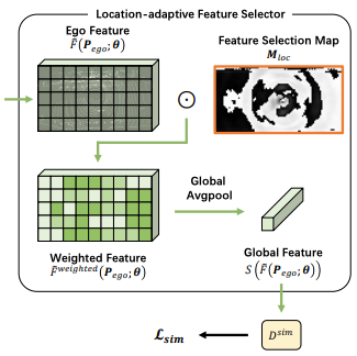 位置自适应的 Sim2Real 适配器 (LSA) 模块旨在弥合模拟数据和真实数据之间的领域差距。 为了从模拟/真实域差距中完全排除代理间域差距,LSA 模块仅区分配备相对相似传感器的代理的特征。即该模块只判断ego智能体的特征属于源域和目标域。具体来说,LSA使用可学习的特征选择图来捕获分布的内部模式,并相应地从自我代理的特征图中选择重要的特征,最终聚合全局特征。该全局特征最终输入判别器D_sim进行仿真域和真实域的判断。
