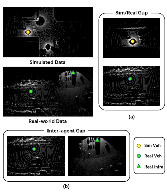 车路协同无监督域适应的挑战 domain gap主要包含两部分:sim/real domain gap和inter-agent domain gap。 sim/real domain gap来源于点云数据的密度、分布和反射值等差异,inter-agent domain gap来源于传感器的类型和放置位置。