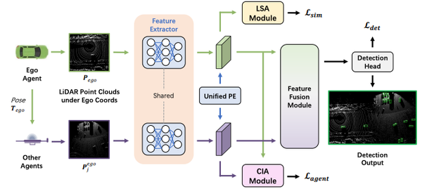 下图是一个中期车路协同检测的框架图,ego 智能体和其他智能体的点云特征会在feature fusion module进行融合,用于对更广泛视野的目标检测。