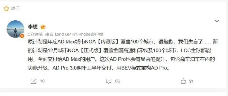 再比如理想方面,原计划年底AD Max城市NOA内测版覆盖100个城市,但李想微博公布最新计划变为12月城市NOA正式版覆盖全国高速和环线及100个城市,全面交付给AD Max的用户。