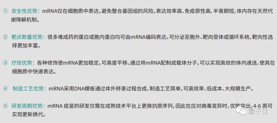 由于mRNA具有安全性优势、靶点数量优势、疗效优势、制造工艺优势和研发周期优势,可应用于预防疫苗、治疗疫苗、治疗药物等领域。