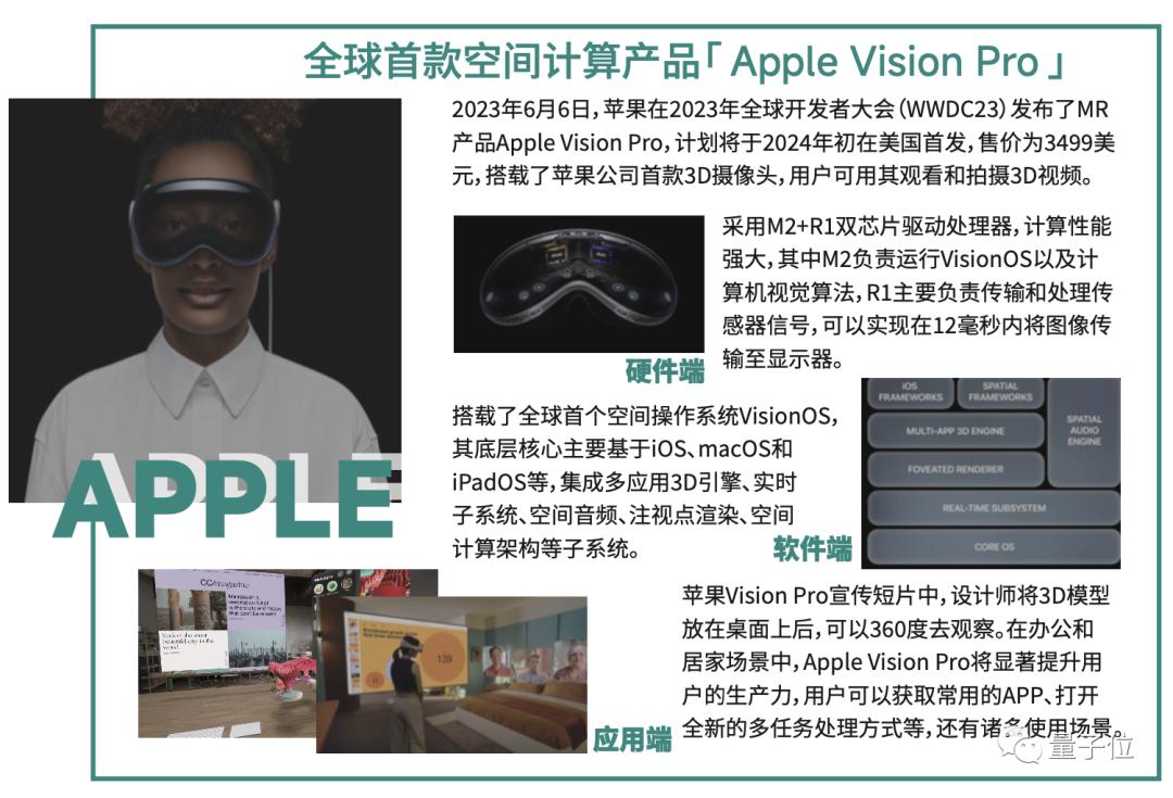 6月苹果在WWDC2023开发者大会上正式推出了第一款空间计算设备Apple Vision Pro,这一代表性消费级空间计算产品的问世,真正将「空间计算」这一概念推向大众并迅速普及。
